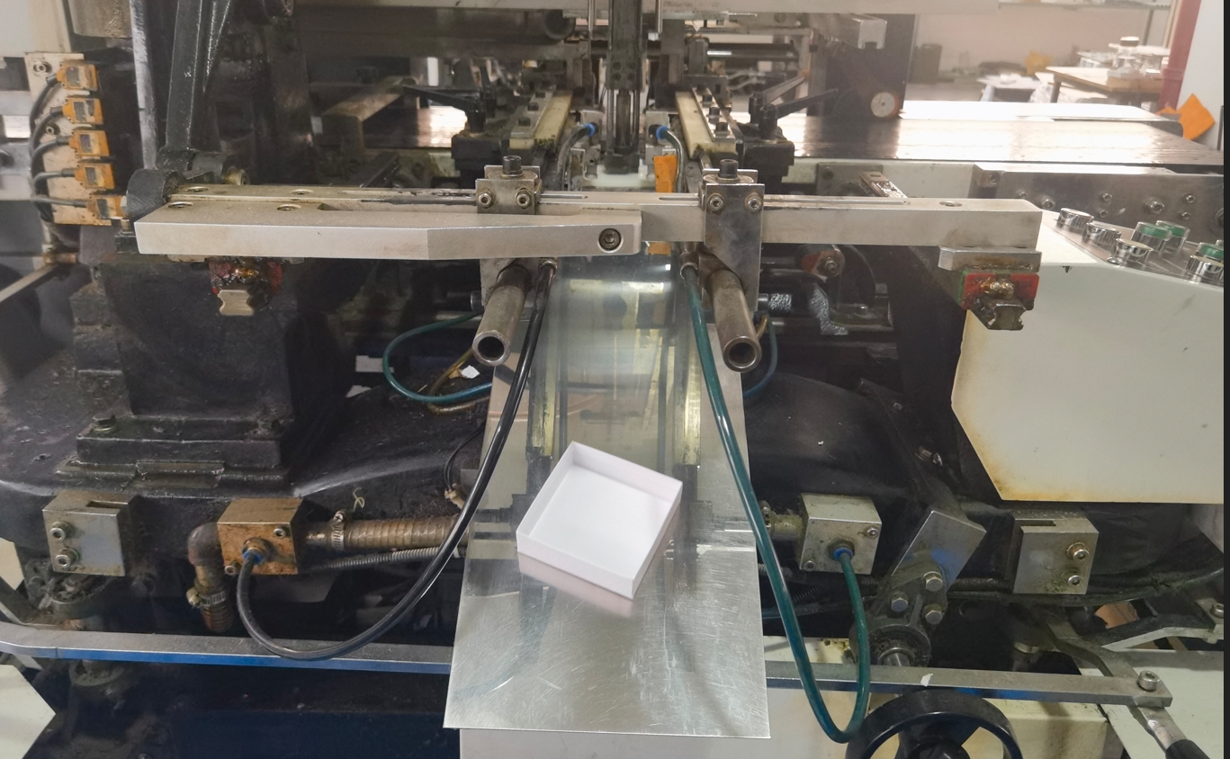 3.Assembling the Box: Apply glue along the edges of the base piece by machine, make sure the paper and board are securely glued together. One machine for lid, other for base, we have six automatic machine, the total production capacity for jewelry boxes is more than 100,000 sets per day.
